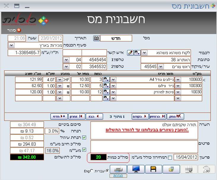 כלכלית 2.101 כולל שדה חדש: סה''כ כמות, אשר סוכם את כמות הפריטים במסמך . דבר זה יכול לסייע רבות לעסקים המוכרים סחורות בעת הפקת מסמך כגון תעודת משלוח, המכילה כמות גדולה של פריטים.